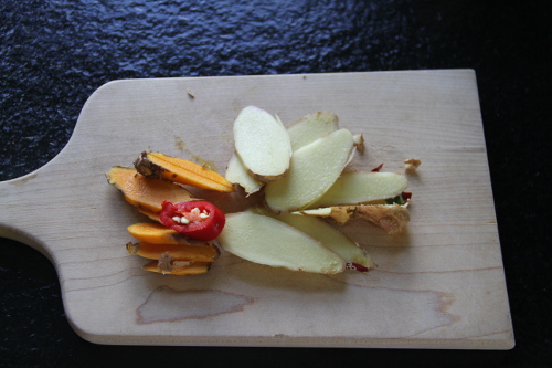 - Einige Scheiben frische geschnittener Bio-Ingwer (doppelte Daumengröße, ca. 30-40g)