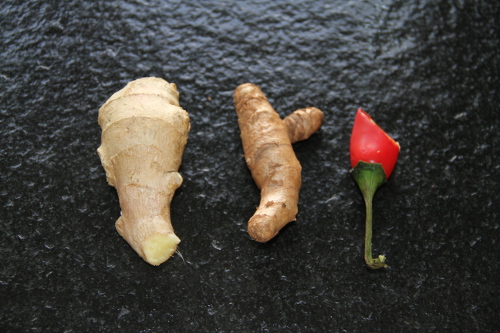 - Ein gestrichener Teelöffel fein gemahlener Kurkuma – oder noch besser: ca. 25g frischer Kurkuma